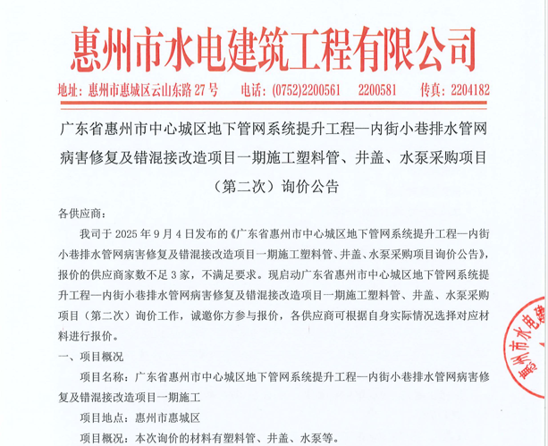 廣東省惠州市中心城區(qū)地下管網系統(tǒng)提升工程-內街小巷排水管網病害修復及錯混接改造項目一期施工勞務采購(第二次)中選候選人公示……